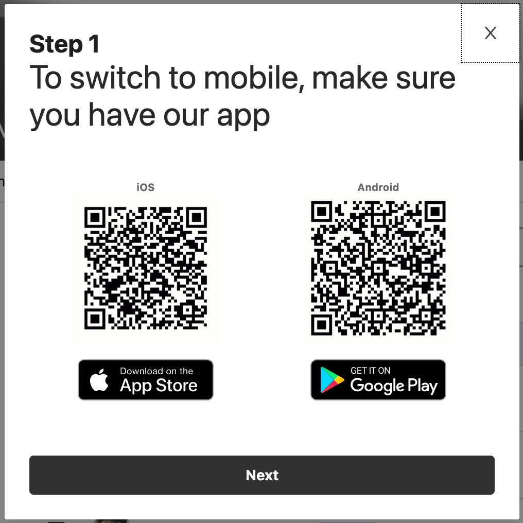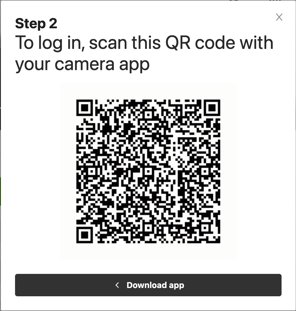 Selecting the option will bring up a modal, where the user can download the correct app from their app store of choice. They will need to point their device's camera at the appropriate QR code to download it.