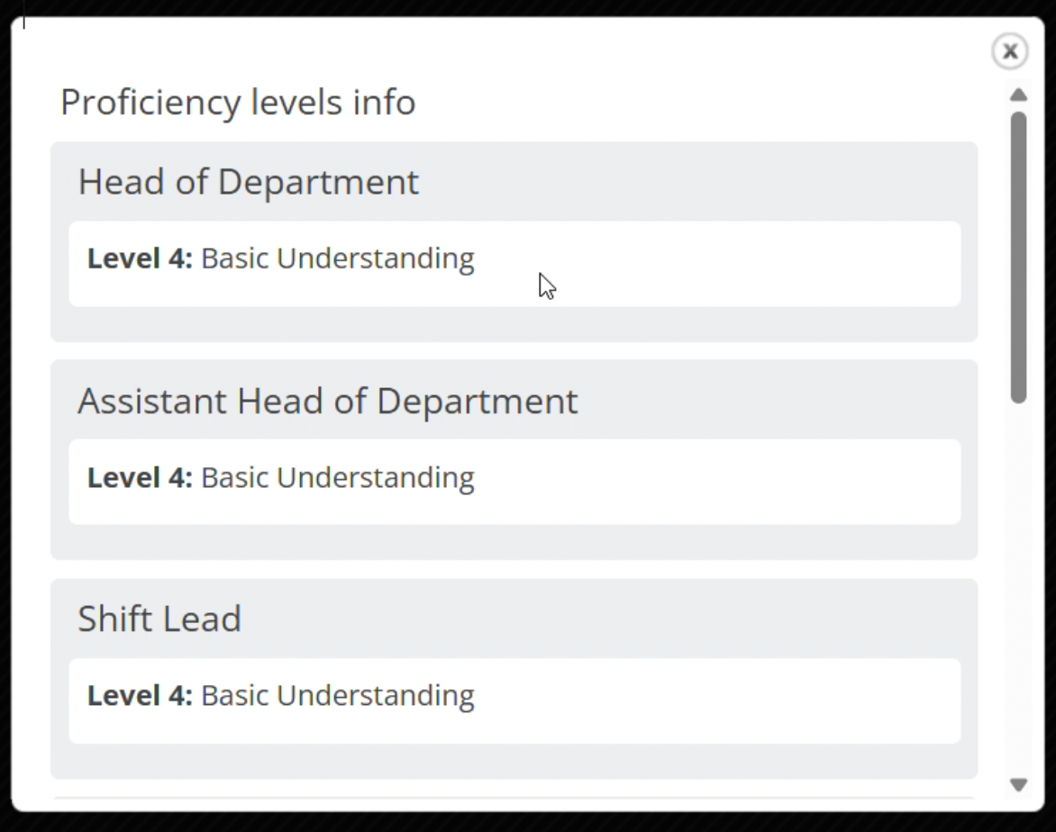 That will open a modal displaying the jobs and proficiency levels required for each.