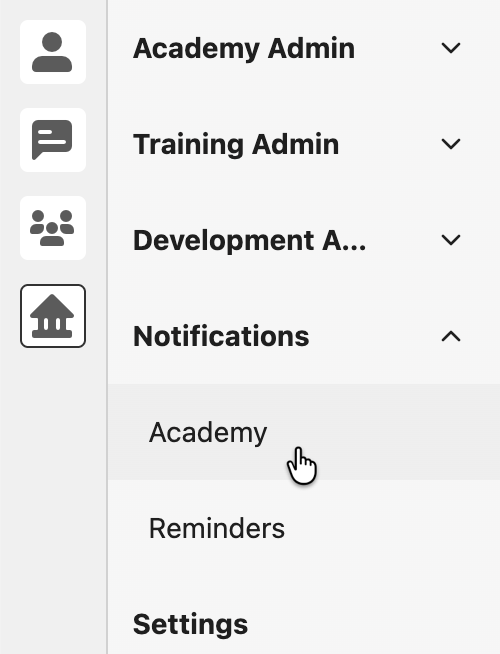 This release moves all notifications from the Academy Admin, Training Admin, and Development Admin sections to their own space in the Academy Workspace. This includes both Academy and Reminder notifications.