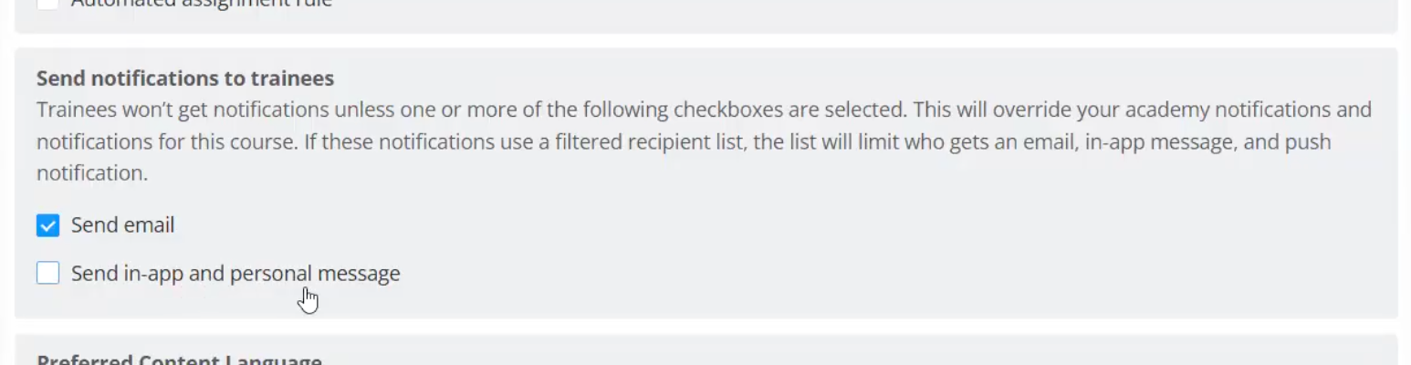Previously, when assigning training, both emails and in-app notifications were sent. This release provides the choice of sending one or the other or both.