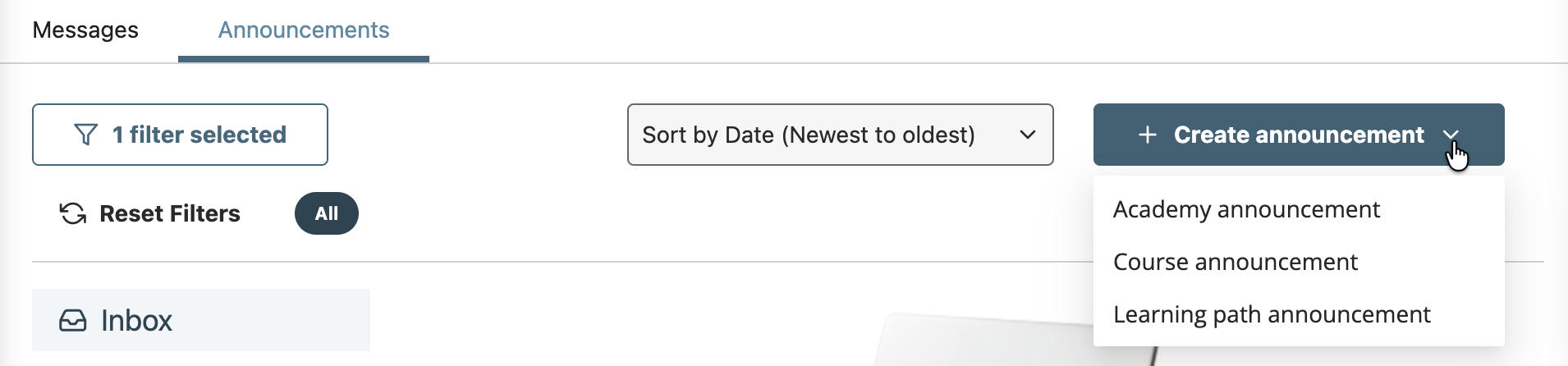 If you have permission to create an announcement, a Create Announcement drop-down menu will be present in the upper-right corner of the page. Selecting the drop-down will reveal three options — Academy announcement, Course announcement, and Learning path announcement.