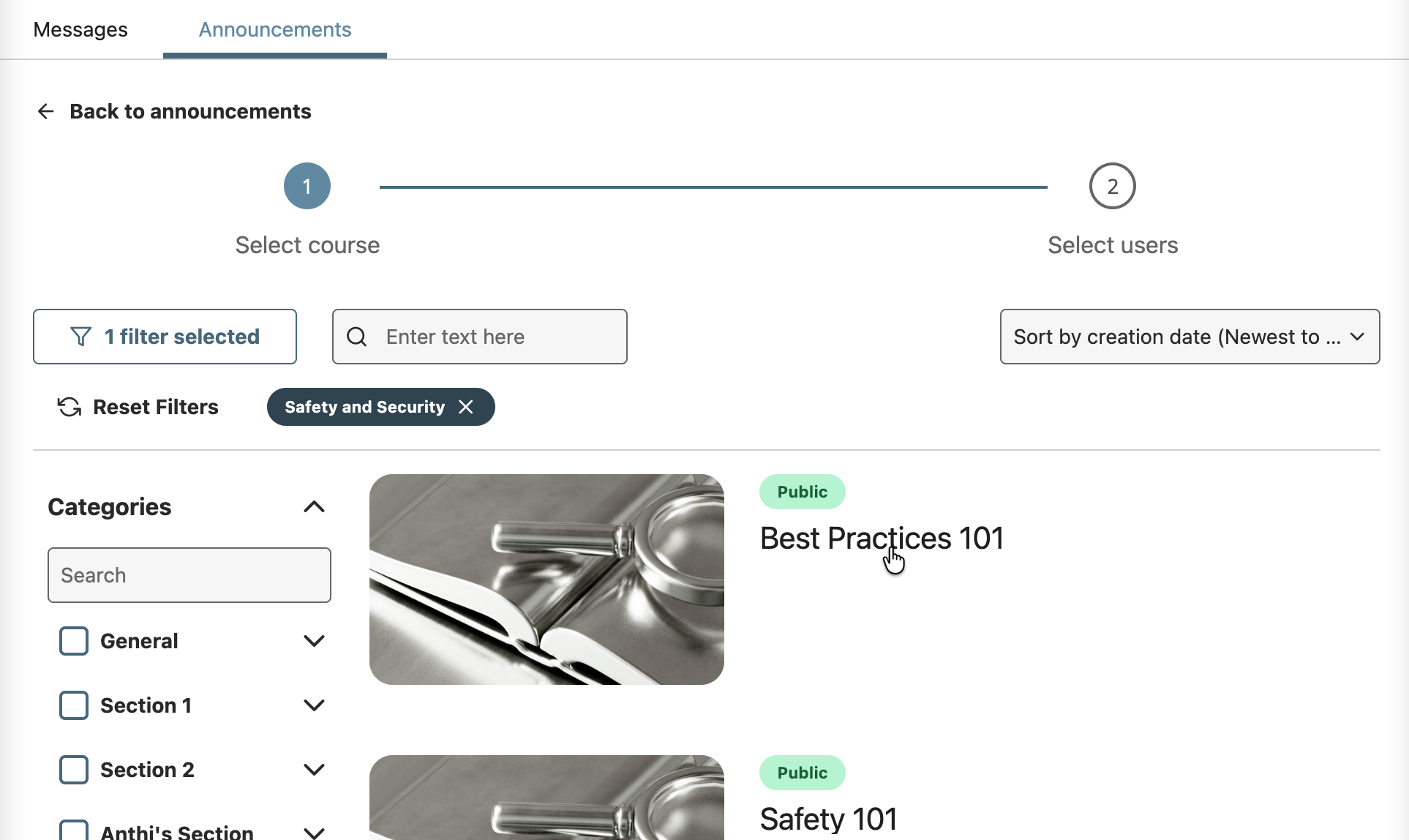 Selecting Academy announcement will allow you to specify who should receive the announcement, whereas Course and Learning path announcement will also include the training to which the announcement should be associated.