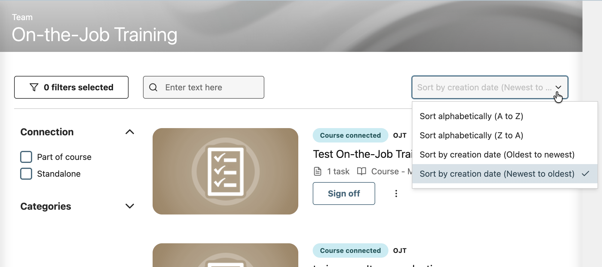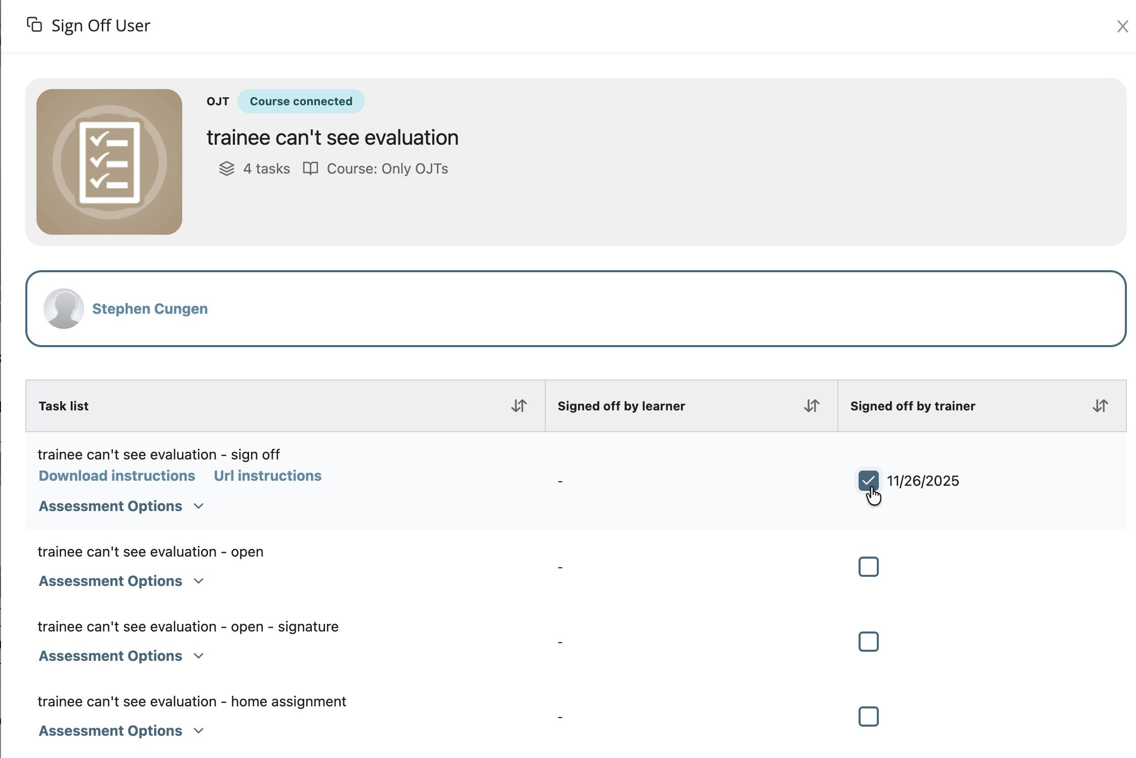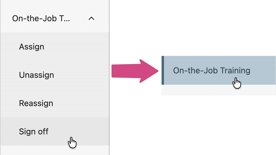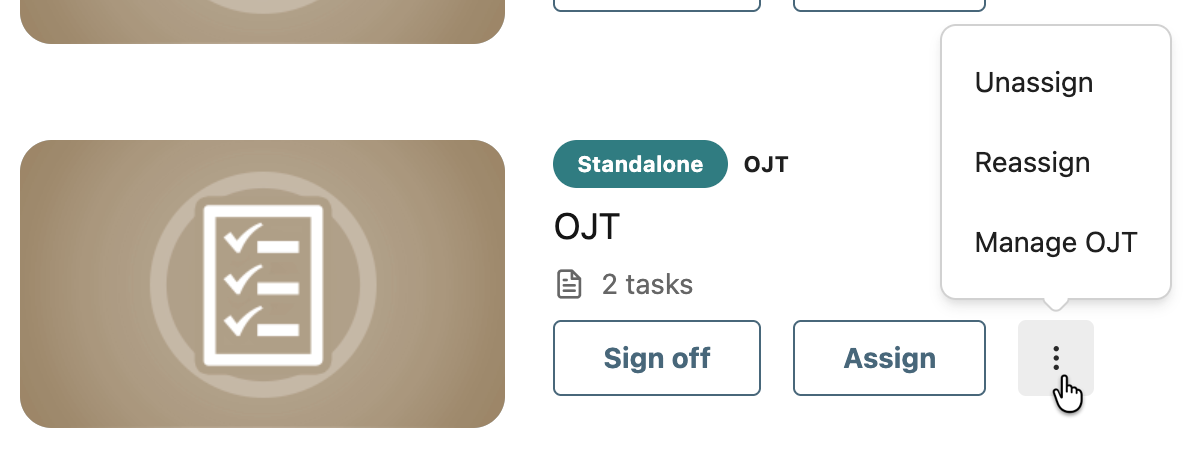 When allowed to do so, a manager can sign off, assign, unassign, reassign, and manage specific OJTs from the list.