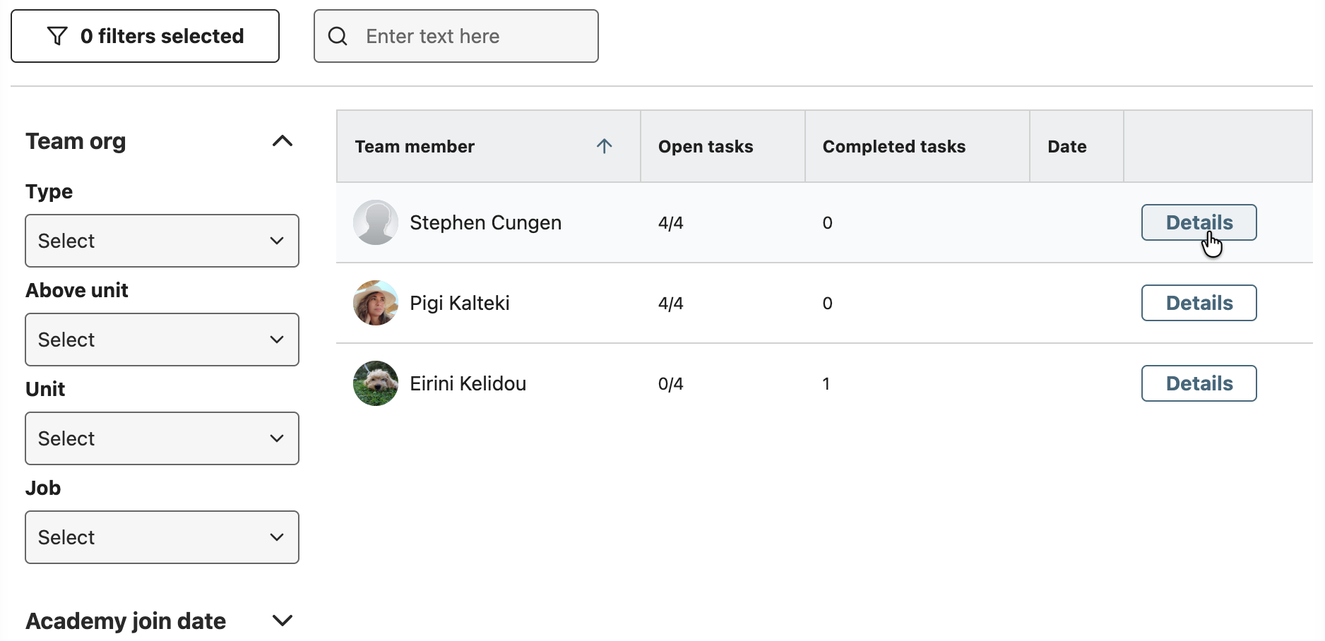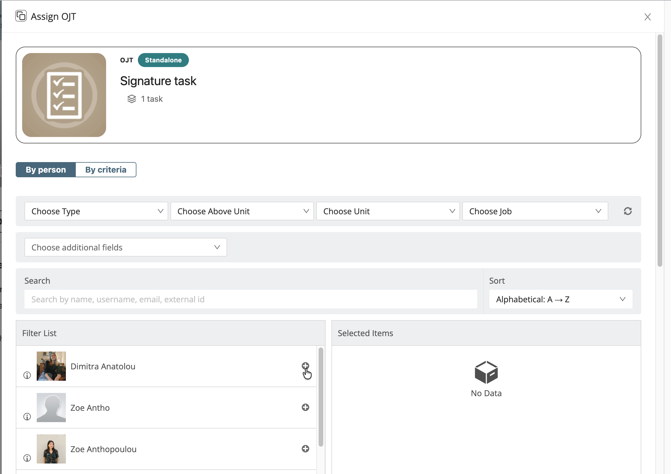 When signing off on an OJT, a list of participants will display. Specific individuals can be more easily found by filtering on the left or by searching. Filtering options include organizational entity, join date, hiring date, and custom field.