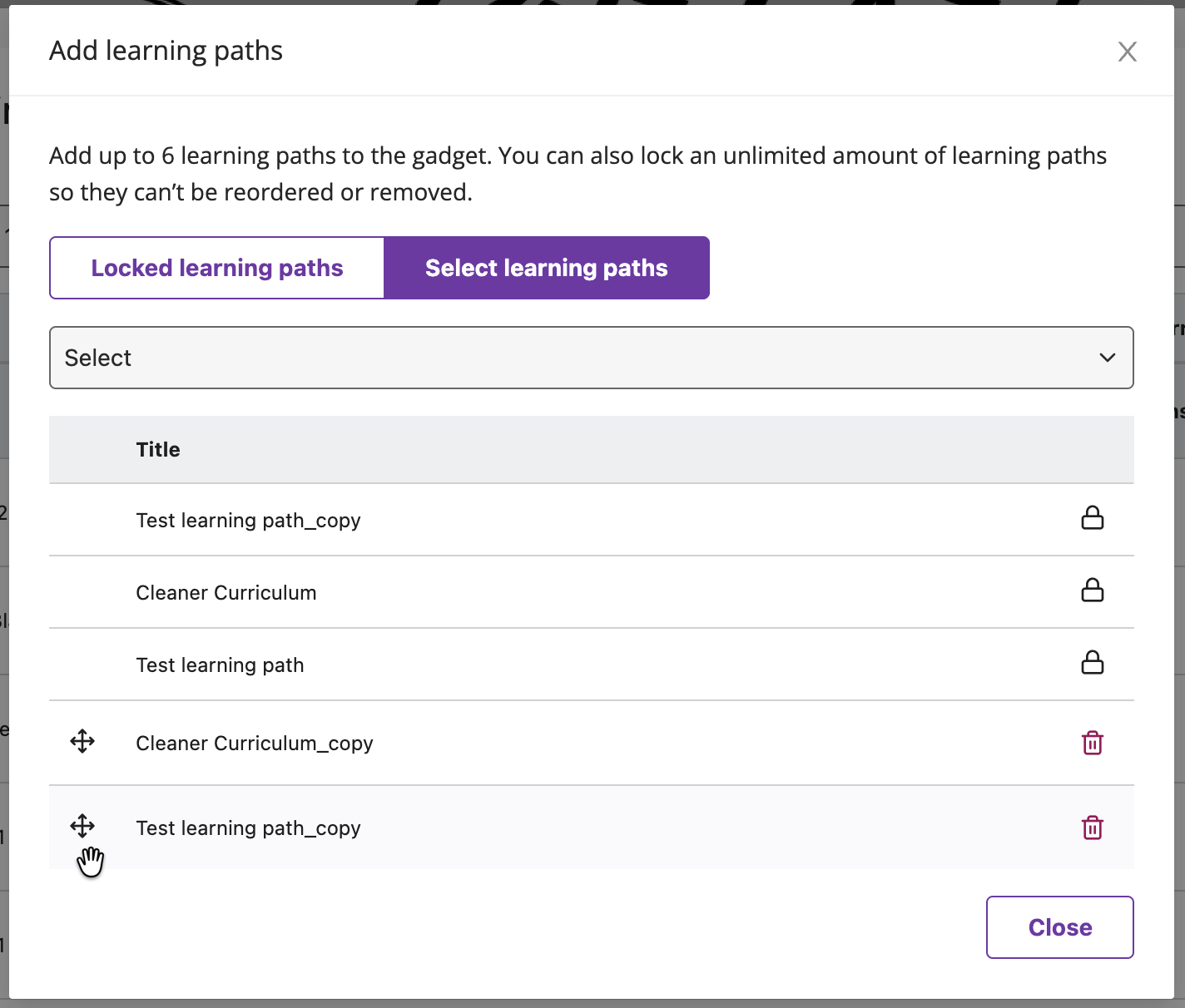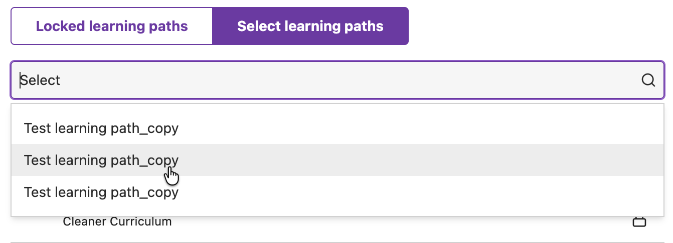 Admins will see two tabs at the top of the modal — Locked learning paths and Select learning paths.
