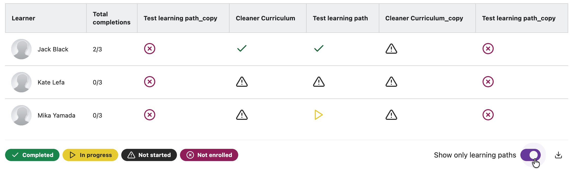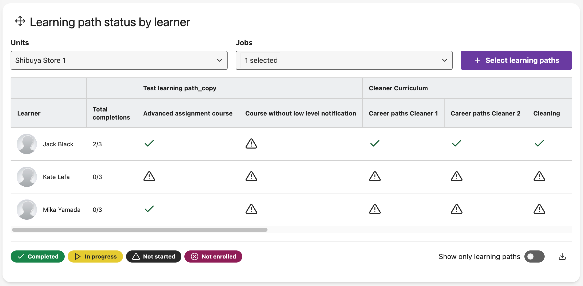 Progress can be tracked by the individual courses within each learning path, as well as by the learning paths themselves.