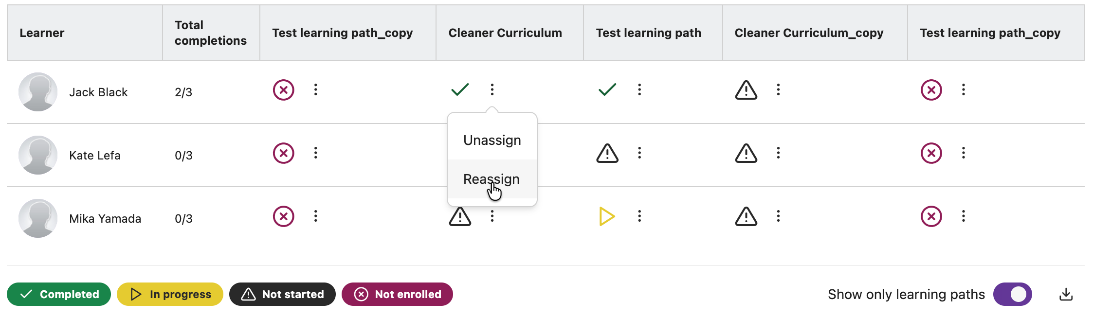 If enabled in your academy, a three-dot more menu allows for specific actions, based on the status of the course or learning path — like assign, reassign, and unassign.