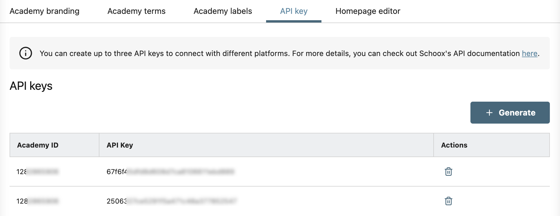 The API Key page (Academy Workspace > Academy Admin > Configuration > General) has had its explanation wording consolidated, as well as the generate button moved to the right side of the page from the left.