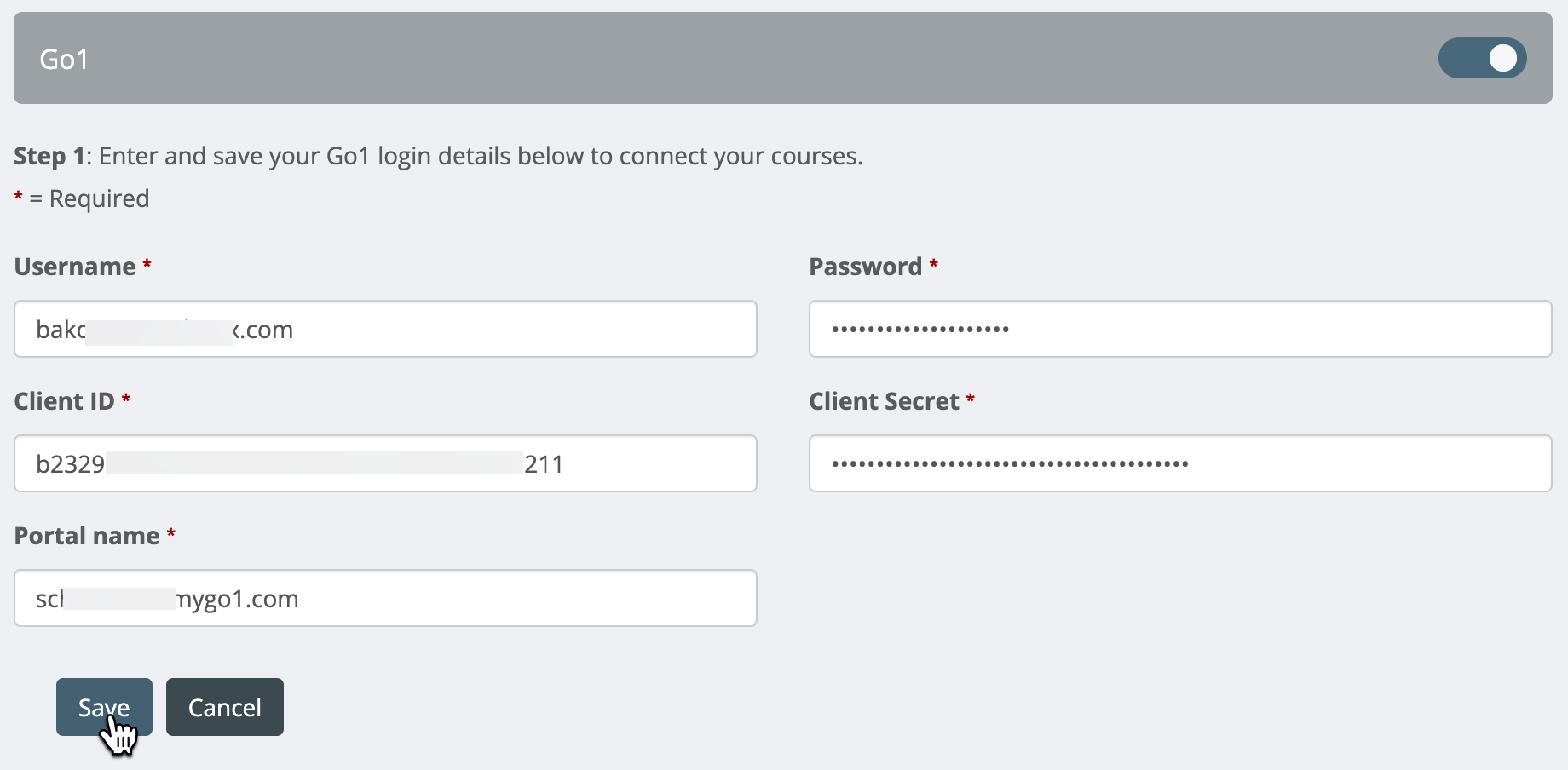 Enter the appropriate Go1 account information into the spaces provided; you should be able to find all needed details within your G01 account. When finished, save.