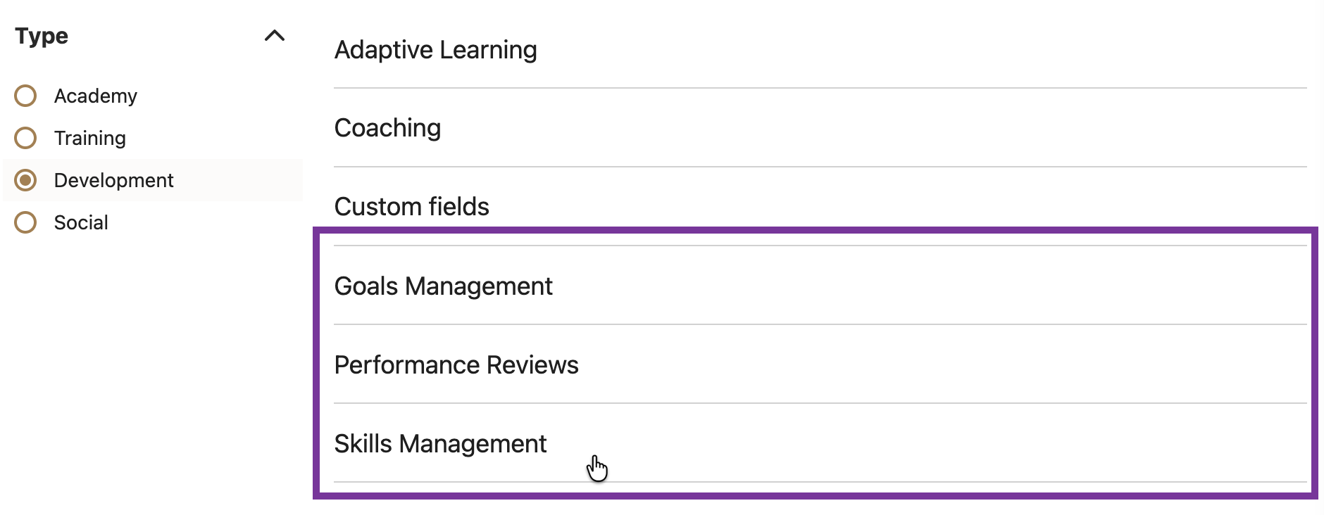 This release removes the parent Performance Settings menu option (Academy Workspace > Settings > Development), and instead shows the three options (Skills Management, Goals Management, and Performance Reviews) on their own.