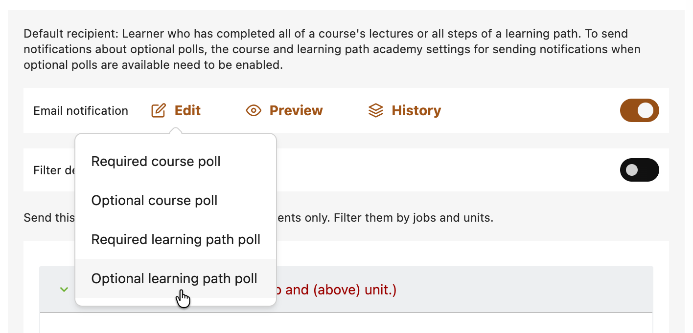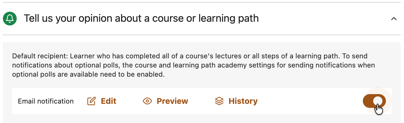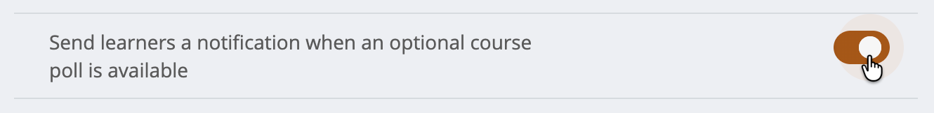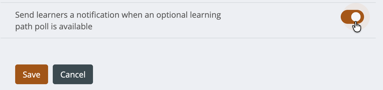 Near the bottom of the list, there is a new option — Send learners a notification when an optional course / learning path poll is available. Toggle the option on, and save.