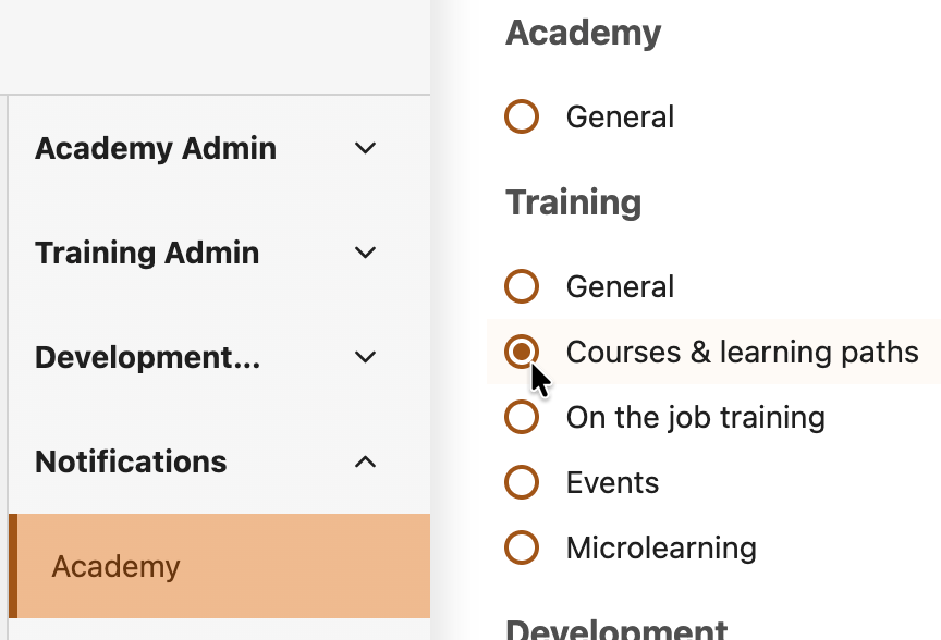 The option can be found in the Academy Workspace, under Settings. In the Training section, select either Courses or Learning Paths.