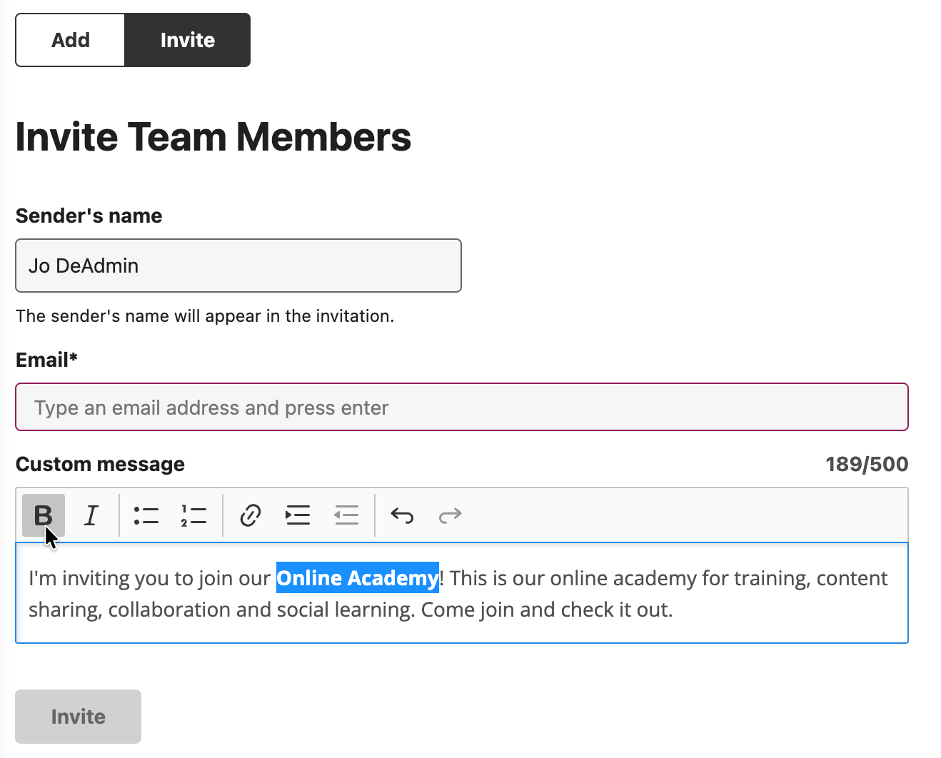 Admins can now add the sender's name. A rich text editor has also been added to the custom message.