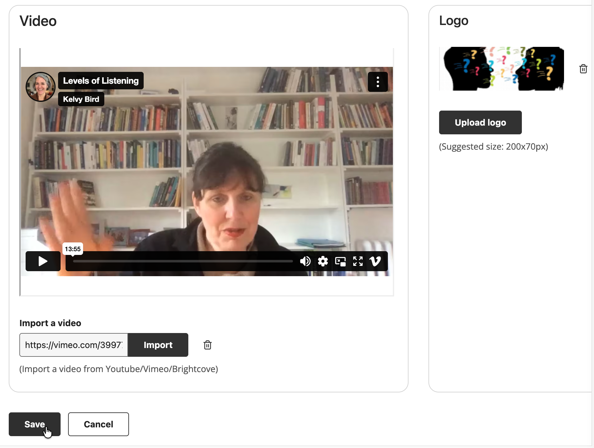 The video must be hosted on a major streaming platform, and be openly viewable (not behind a password or otherwise blocked). The image can be uploaded, and the suggested dimensions are 200 pixels by 70 pixels.