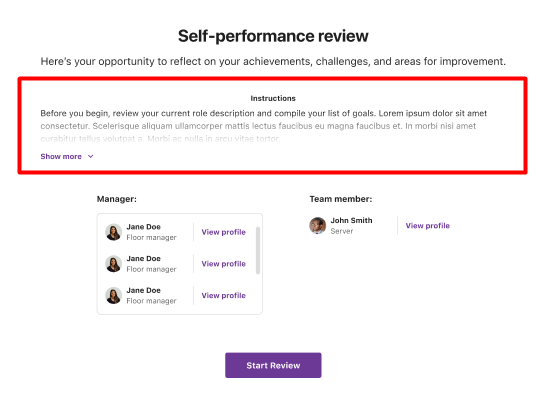 The instructions will appear on the performance review's intro pages, for both managers and team members.