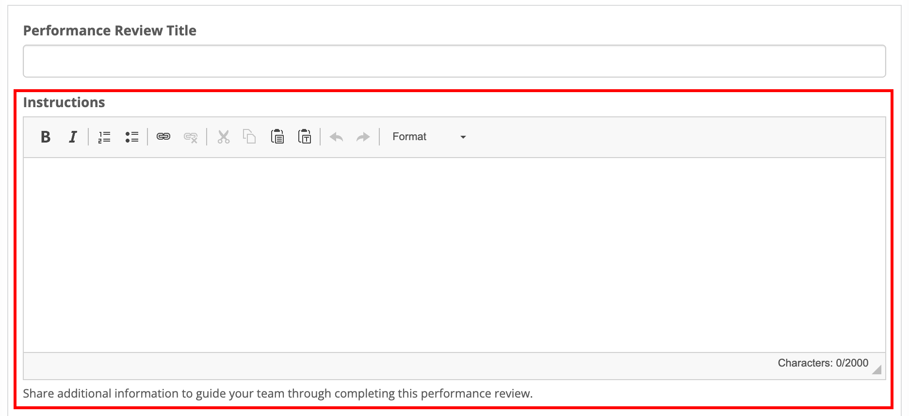When setting up new performance review profiles and templates, there is now a new rich text field — Instructions. Up to 2000 characters can be added to the field.