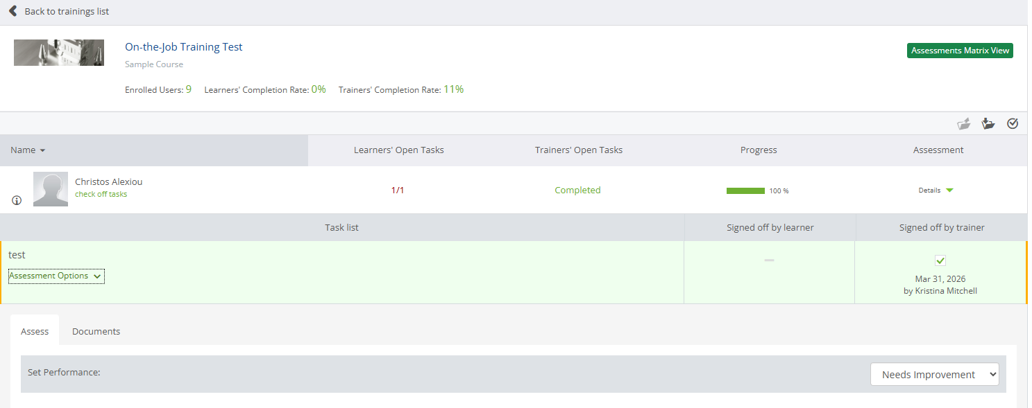 Select the On-the Job Training section to expand settings. In this section, you will locate 3 options that are available for your task assessment.