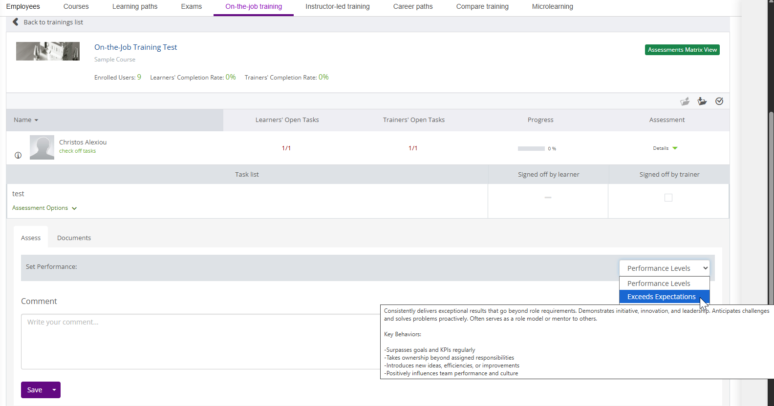 If performance levels are chosen, you can define titles of each level, a detailed description, and a color code level indicator. The detailed description will be available to a manager as they sign off their tasks within the On-the-Job Training dashboard. You can hover over the performance level in the dropdown to see the full description of each option.
