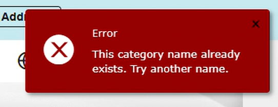 If the addition of a duplicate category or group is attempted, an error message will appear, letting the user know they are unable to do so.