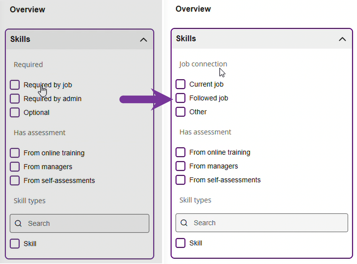 The Assign and Unassign Skills pages have had a refresh to bring them more into alignment with the New Experience design language. There are now filtering and search options. Filter options include Skills groups, categories, and types.