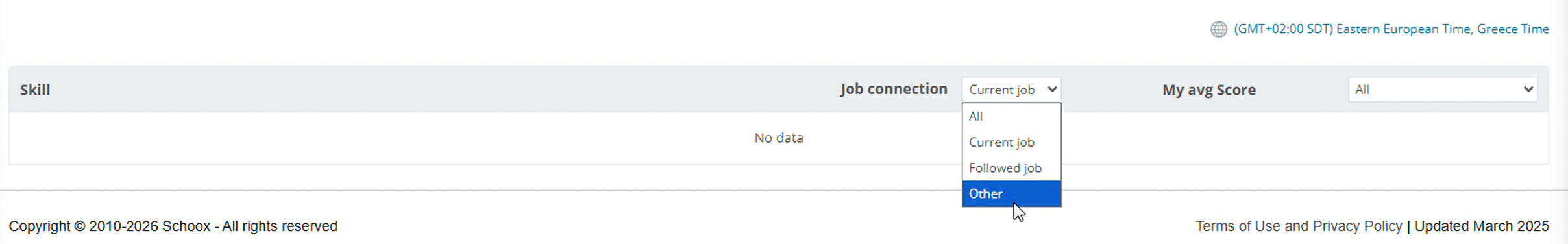 In the learner's analytics dashboard (Learner Workspace > Analytics > Skills), instead of Required (Required by job, Required by admin, and Optional), learners will now see Job connection (Current job, Followed job, and Other).