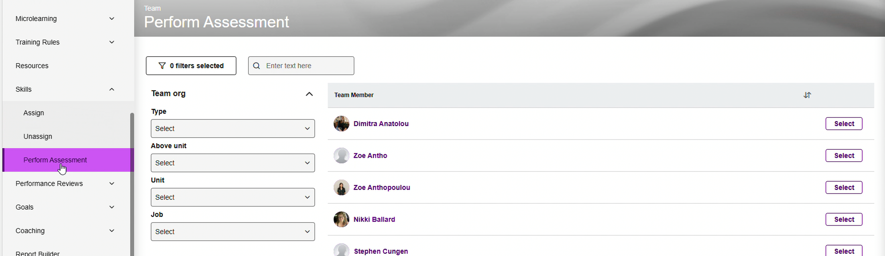 The Perform Assessment page has had a refresh to bring it more into alignment with the New Experience design language. There are now filtering and search options. Filter options include type, above unit, unit, and job.
