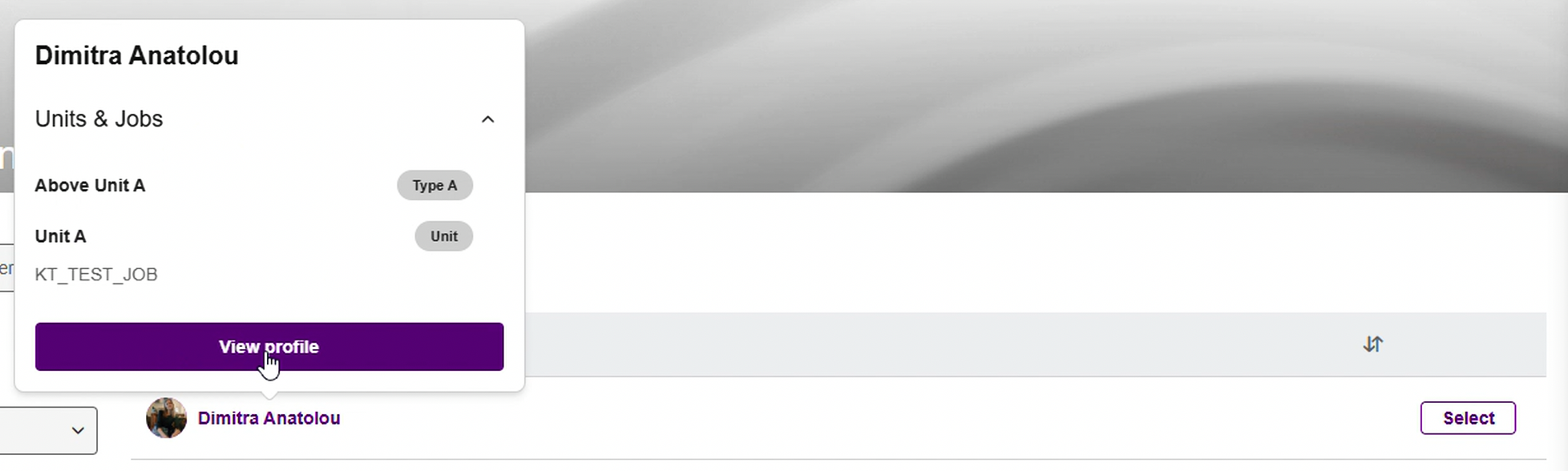 Selecting a user's name will open an information modal, with easy access to the user's profile.