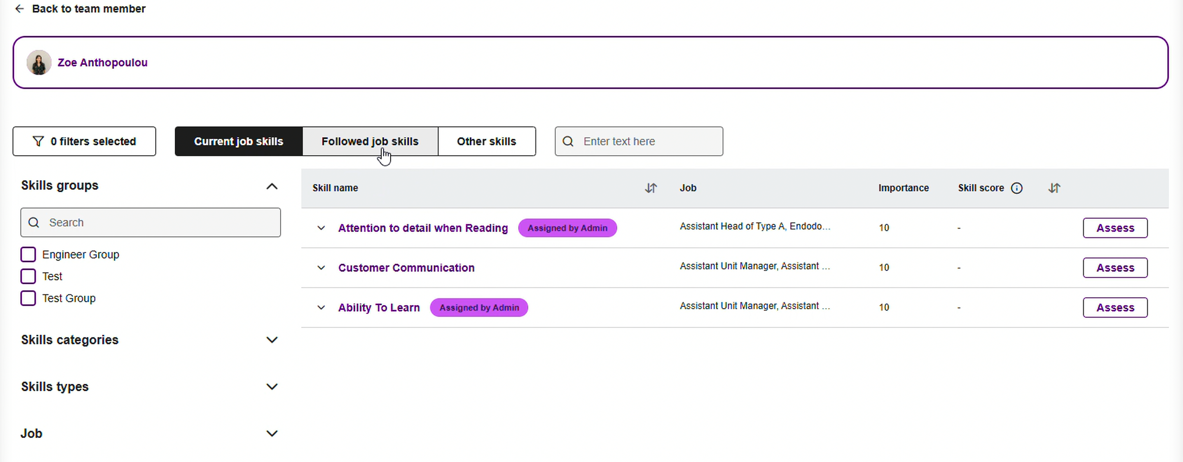 The individual assessment page has had a refresh to bring it more into alignment with the New Experience design language. There are now filtering and search options. Filter options include skill groups, skill categories, skill types, and jobs. There are also three tabs — current job skills, Followed job skills, and Other skills. Select Assess to start an assessment.