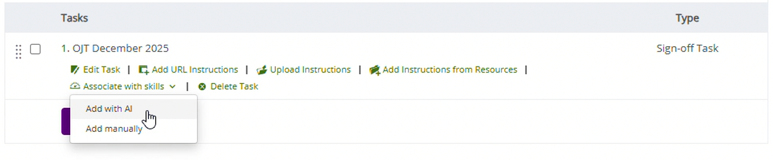 OJT tasks can be associated with specific skills. This release adds the ability to choose between manually associating skills or using AI to assist. This works in very much the same way as mapping skills in your academy.