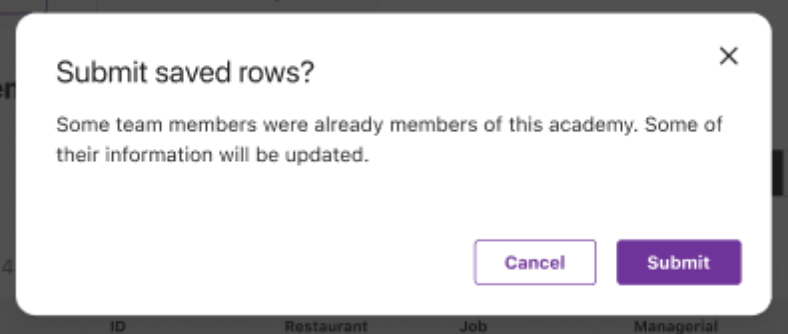 A warning will also appear at the beginning of the row; hovering over the warning will let you know that the individual already exists in the academy, and that you can only adjust their information.